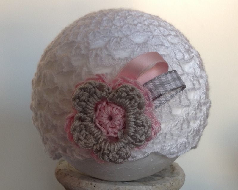 Mutsje die heel erg lief staat, wit opengehaakt mutsje met licht en donkerroze, 2 lintjes die het helemaal afmaken