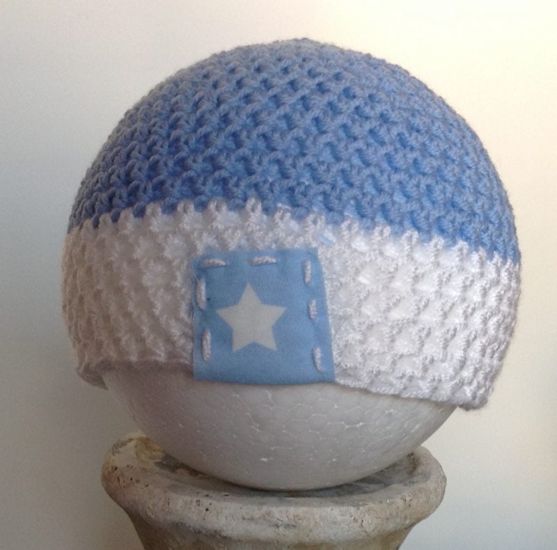 Jongensmutsje lichtblauw met wit een als afwerking een stukje stof.
